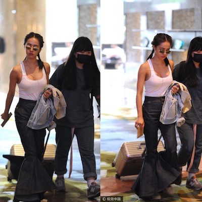 蔡依林近日現身上海機場,只見她身穿白色蕾絲花邊小可愛,因為合身反而襯托出傲人上圍,下半身則是搭配高腰魚尾褲,褲管下緣則如同喇叭花花瓣,走路時會隨之擺動散開,遠看時宛如一隻美人魚行走在路上,不過內搭著膚色的NuBra在行走過程不慎走光,但仍將前衛的時尚品味發揮得淋漓盡致。